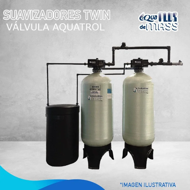 Sistema de suavizador twin con válvula aquatrol de la marca Aqua Plus, compuesto por dos tanques grandes y un tanque más pequeño conectado con tuberías y válvulas.